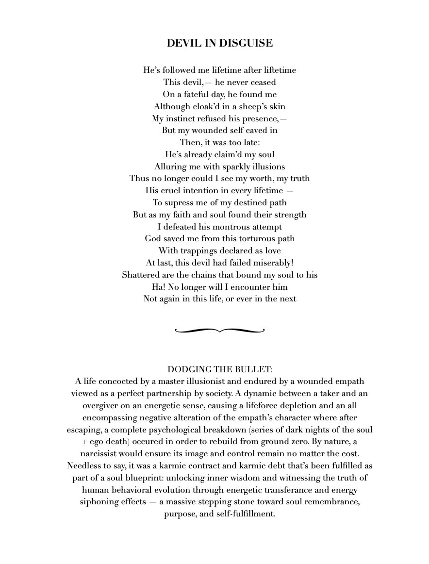 Allow the words to penetrate your very soul and irritate your demons so that they can be brought up to the surface for healing. It’s all coming from a place of love — I promise. When you sense a surge of emotions being triggered, sit with them in silence and introspect, even if you have to converse with your human self (projecting sends out negative energy, which will be returned to you). Whatever you do, be gentle with yourself because you have just entered the arena into a battle between your light and dark, making the unconscious conscious.