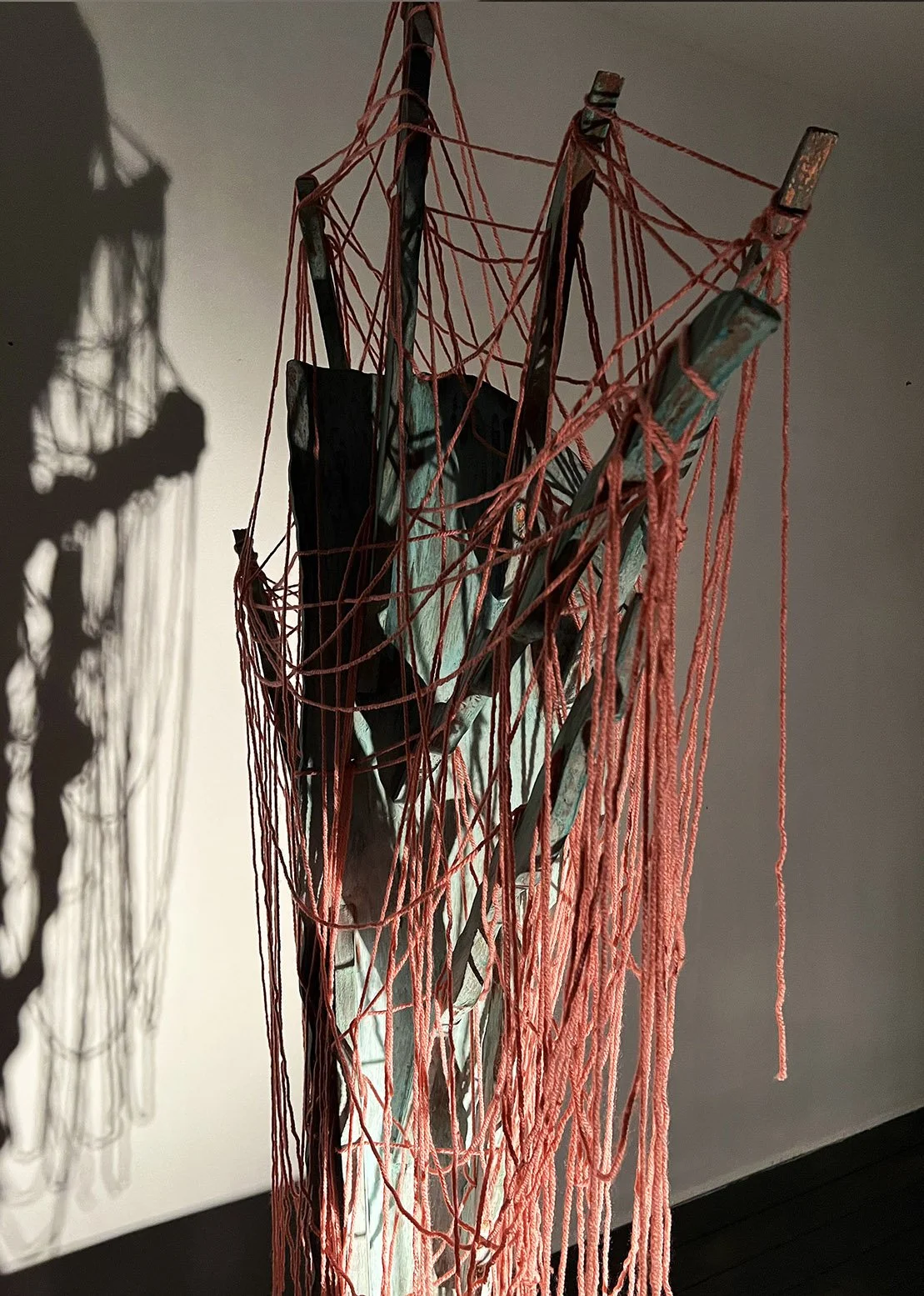 Imagine finding yourself in a place where nature and human beings intertwine in a deep and sincere embrace. “Radici” is a work that invites us to explore the essence of our existence, to reflect on the indissoluble bond that unites us to the earth and everything that surrounds us. At the center of this creation, there is a wooden seat, an element that tells stories of growth and transformation. Its tree, with its twisted branches, symbolized each individual’s unique journey, the challenges faced, and the victories celebrated. Every curve and every fold represents evolution, a journey that leads us to discover who we really are; the pink wool threads, where harmonious and where extremely intertwined, evoke the fragility and beauty of human relationships. These threads are a reminder of that subtle bond that unites us with each other and with the environment around us. Every knot is a memory, every weave a connection, an invitation to cultivate empathy and mutual understanding. The bend with its irregular shape invites us to reflect on the beauty of imperfection. In a world that often celebrates perfection, this work reminds us that it is precisely in our imperfections that we find authenticity and uniqueness. It invites us to take a break, to stop and contemplate the world around us, to rediscover the wonder in the little things, and to reconnect with ourselves. Finally, the copper green color is a celebration of the fusion between the natural and the artificial. It is a visual reminder that underlines how our existence is intrinsically linked to the earth, an invitation to reflect on how our actions influence the environment and how we can live in harmony with it.